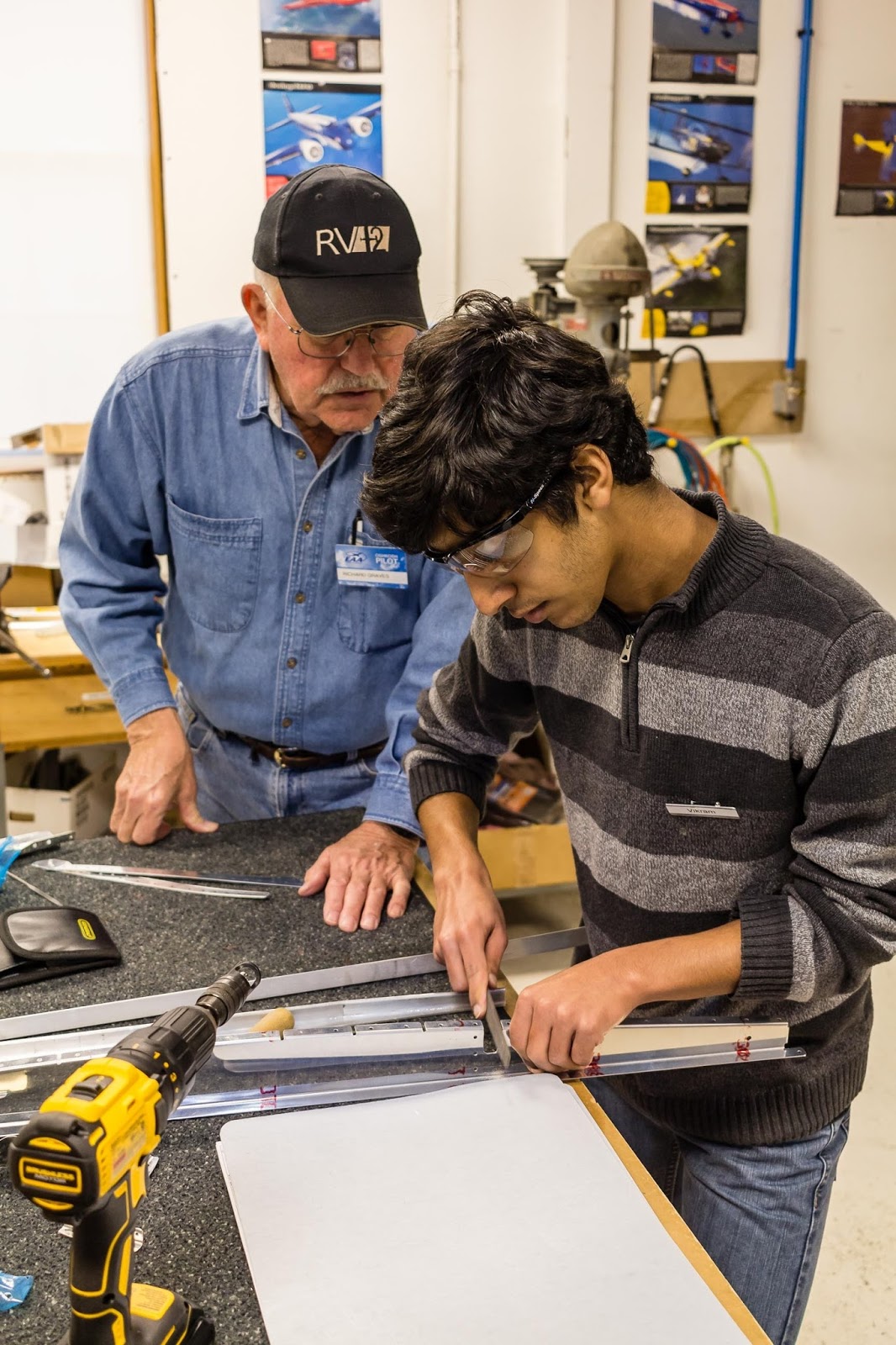 Hi everyone! It's back to building at the TF5 hangar after the summer break. Over the past few classes, progress has resumed on various areas of the build. The primary task has been preparing the interior fuselage for paint. This calls for the tedious task of using scotch brite to remove the aluminum oxidation in order to increase the adhesiveness of the paint to the surfaces. The fuselage was then cleaned, masked off, and transported for painting. The fuel tank has also proven to be an important task. Over the last few weeks, the tank has been sealed and tested. As of now, our first test shows that the tank is holding air by the pressure in the balloon. Furthermore, the wing spars have been started, and the ribs are ready for assembly. The structural flanges are currently being riveted, and the tie down attach points have been tapped. In addition, a hinge adjustment to the engine cowl was worked on, and the oil door is under progress.